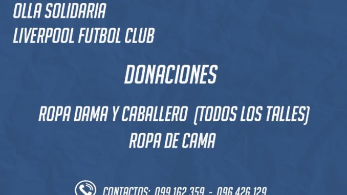 La olla solidaria de Liverpool Fútbol Club continúa recibiendo donaciones, en esta oportunidad se solicita en lo posible, ropa de dama y caballero en todos los talles, además de ropa de cama.